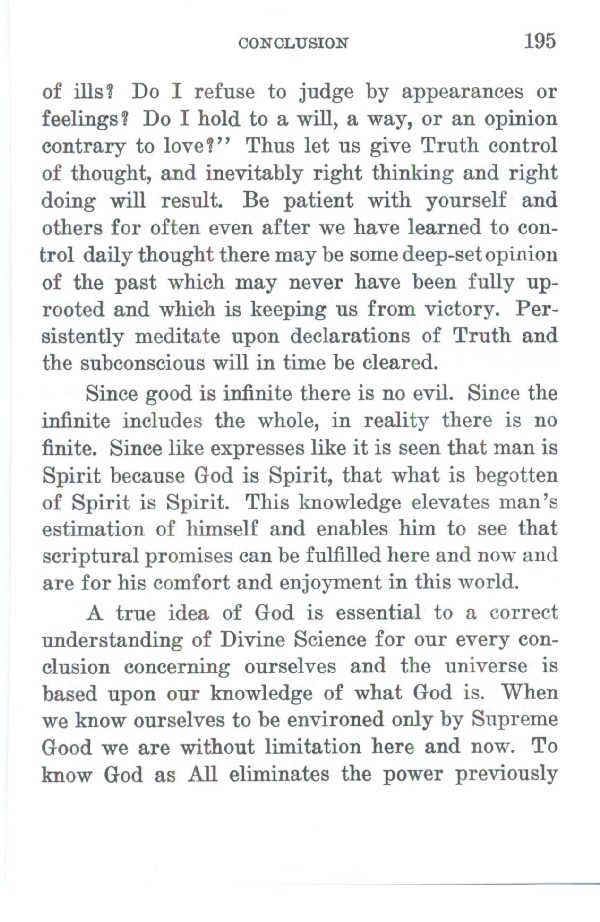 Since good is infinite there is no evil. Since the infinite includes the whole, in reality there is no finite. Since like expresses like it is seen that man is Spirit because God is Spirit, that what is begotten of Spirit is Spirit. This knowledge elevates man's estimation of himself and enables him to see that scriptural promises can be fulfilled here and now and are for his comfort and enjoyment in this world. A true idea of God is essential to a correct understanding of Divine Science for our every conclusion concerning ourselves and the universe is based upon our knowledge of what God is. When we know ourselves to be environed only by Supreme Good we are without limitation here and now. To know God as All eliminates the power previously