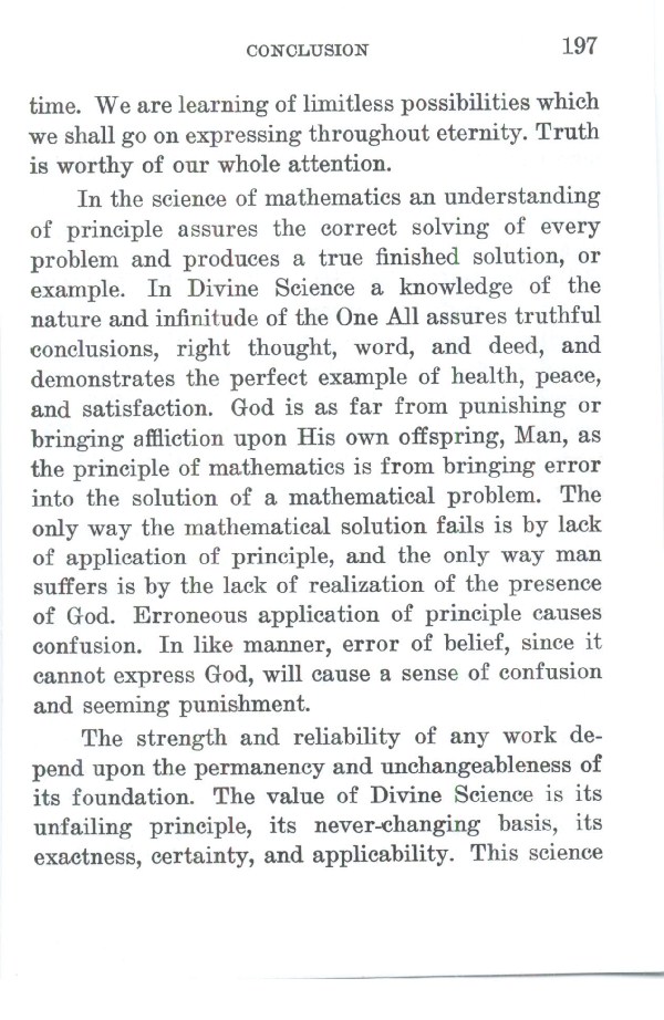 In the science of mathematics an understanding of principle assures the correct solving of every problem and produces a true finished solution, or example. In Divine Science a knowledge of the nature and infinitude of the One All assures truthful conclusions, right thought, word, and deed, and demonstrates the perfect example of health, peace, and satisfaction. God is as far from punishing or bringing affliction upon His own offspring, Man, as the principle of mathematics is from bringing error into the solution of a mathematical problem. The only way the mathematical solution fails is by lack of application of principle, and the only way man suffers is by the lack of realization of the presence of God. Erroneous application of principle causes confusion. In like manner, error of belief, since it cannot express God, will cause a sense of confusion and seeming punishment.