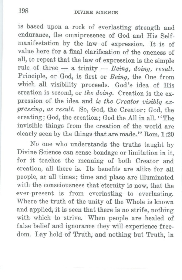 is based upon a rock of everlasting strength and endurance, the omnipresence of God and His Selfmanifestation by the law of expression. It is of value here for a final clarification of the oneness of all, to repeat that the law of expression is the simple rule of three -- a trinity -- Being, doing, result. Principle, or God, is first or Being, the One from which all visibility proceeds. God's idea of His creation is second, or the doing. Creation is the expression of the idea and is the Creator visibly expressing, as result. So, God, the Creator; God, the creating; God, the creation; God the All in all. "The invisible things from the creation of the world are clearly seen by the things that are made." Rom. 1:20