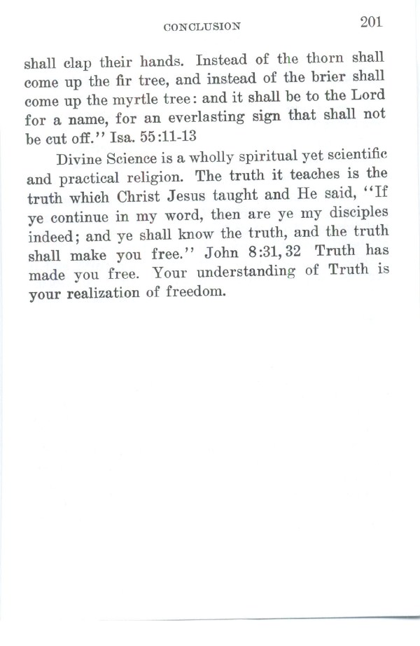 Divine Science is a wholly spiritual yet scientific and practical religion. The truth it teaches is the truth which Christ Jesus taught and He said, "If ye continue in my word, then are ye my disciples indeed; and ye shall know the truth, and the truth shall make you free." John 8:31, 32 Truth has made you free. Your understanding of Truth is your realization of freedom.
