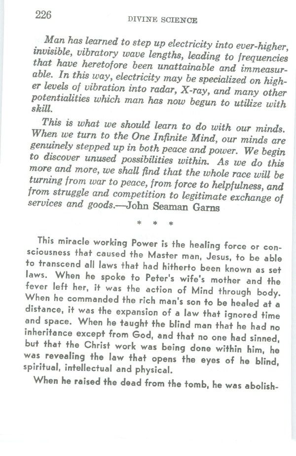 This miracle working Power is the healing force or consciousness that caused the Master man, Jesus, to be able to transcend all laws that had hitherto been known as set laws. When he spoke to Peter's wife's mother and the fever left her, it was the action of Mind through body. When he commanded the rich man's son to be healed at a distance, it was the expansion of a law that ignored time and space. When he taught the blind man that he had no inheritance except from God, and that no one had sinned, but that the Christ work was being done within him, he was revealing the law that opens the eyes of he blind, spiritual, intellectual and physical.