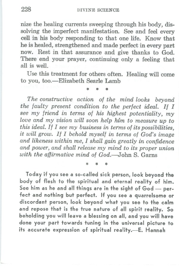 the healing currents sweeping through his body, dissolving the imperfect manifestation. See and feel every cell in his body responding to that one life. Know that he is healed, strengthened and made perfect in every part now. Rest in that assurance and give thanks to God. There end your prayer, continuing only a feeling that all is well.