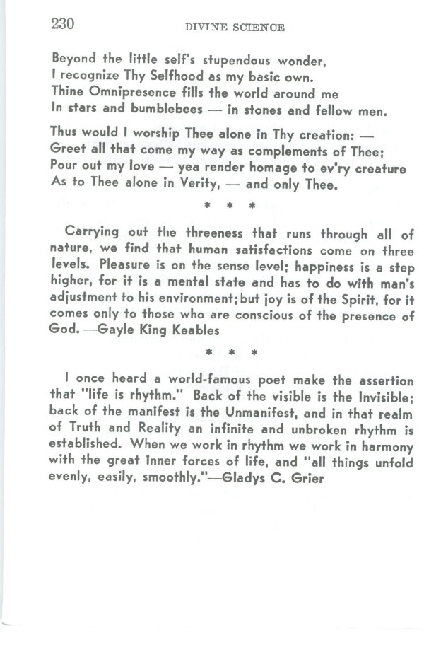 Contents - Foreword - Early History of Divine Science - Revelation - Basis of Divine Science - God and Man are One - Thought - The Work of Thought - Prayer - Healing - Unfoldment - Divine Science Interprets Some Important Doctrines - Practical Application of the Principle - Conclusion - Selected Inspirational Readings - Glossary - Index