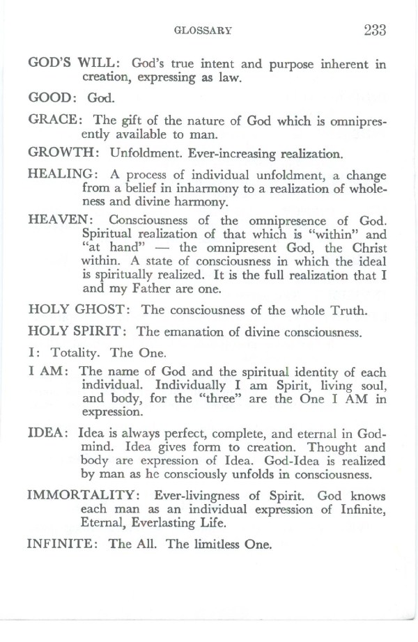 Contents - Foreword - Early History of Divine Science - Revelation - Basis of Divine Science - God and Man are One - Thought - The Work of Thought - Prayer - Healing - Unfoldment - Divine Science Interprets Some Important Doctrines - Practical Application of the Principle - Conclusion - Selected Inspirational Readings - Glossary - Index