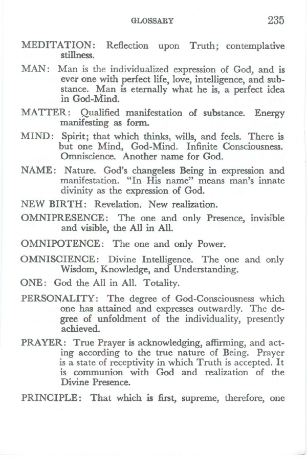 PRAYER: True Prayer is acknowledging, affirming, and acting according to the true nature of Being. Prayer is a state of receptivity in which Truth is accepted. It is communion with God and realization of the Divine Presence.