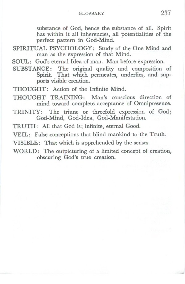 TRINITY: The triune or threefold expression of God; God-Mind, God-Idea, God-Manifestation.