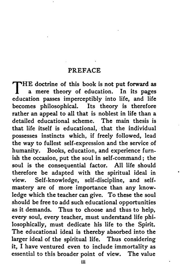 found in this book will accordingly depend for more upon the reader's philosophical ability and spiritual experience than upon the knowledge of conventional theories and methods of education.