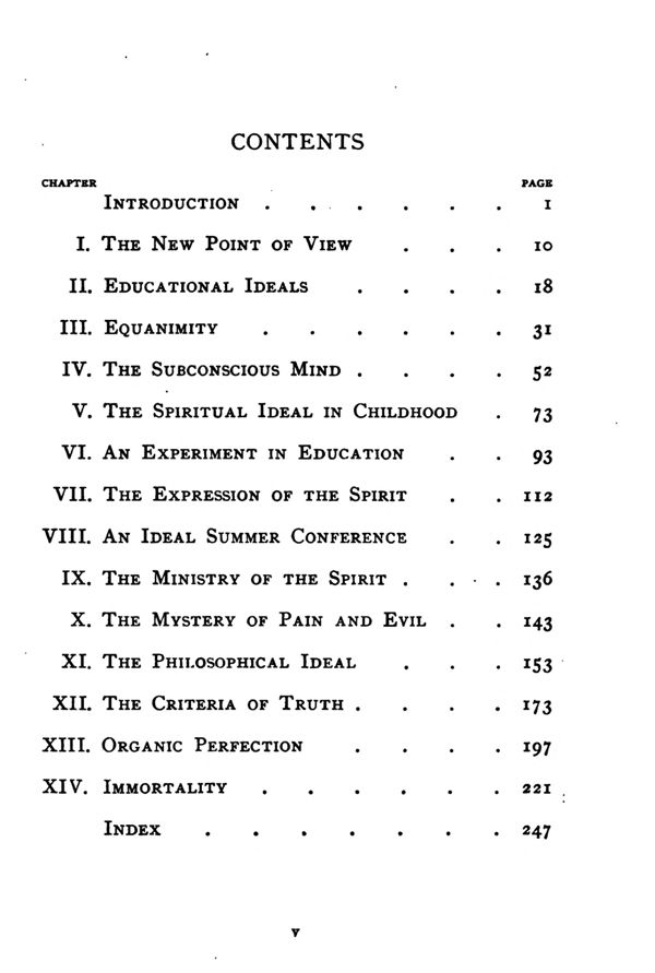 Preface - Introduction - The New Point of View - Educational Ideals - Equanimity - The Subconscious Mind - The Spiritual Ideal in Childhood - An Experiment in Education - The Expression of the Spirit - An Ideal Summer Conference - The Ministry of the Spirit - The Mystery of Pain and Evil - The Philosophical Ideal - The Criteria of Truth - Organic Perfection - Immortality - Index - p. 247