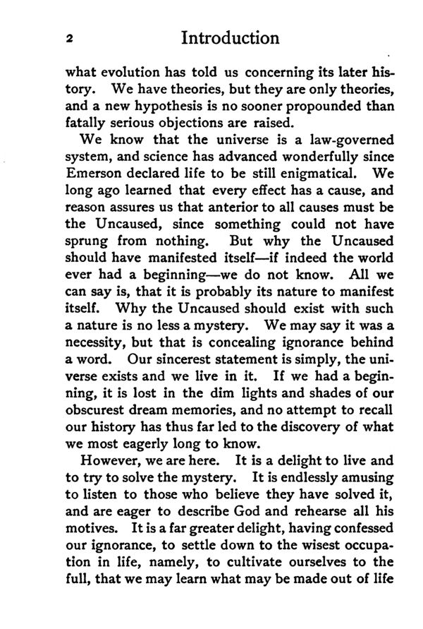 We know that the universe is a law-governed system, and science has advanced wonderfully since Emerson declared life to be still enigmatical. We long ago learned that every effect has a cause, and reason assures us that anterior to all causes must be the Uncaused, since something could not have sprung from nothing. But why the Uncaused should have manifested itself—if indeed the world ever had a beginning—we do not know. All we can say is, that it is probably its nature to manifest itself. Why the Uncaused should exist with such a nature is no less a mystery. We may say it was a necessity, but that is concealing ignorance behind a word. Our sincerest statement is simply, the universe exists and we live in it. If we had a beginning, it is lost in the dim lights and shades of our obscurest dream memories, and no attempt to recall our history has thus far led to the discovery of what we most eagerly long to know.