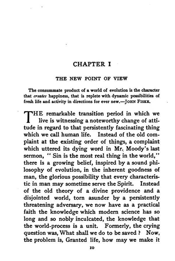 THE remarkable transition period in which we live is witnessing a noteworthy change of attitude in regard to that persistently fascinating thing which we call human life. Instead of the old complaint at the existing order of things, a complaint which uttered its dying word in Mr. Moody's last sermon,"Sin is the most real thing in the world," there is a growing belief, inspired by a sound philosophy of evolution, in the inherent goodness of man, the glorious possibility that every characteristic in man may sometime serve the Spirit. Instead of the old theory of a divine providence and a disjointed world, torn asunder by a persistently threatening adversary, we now have as a practical faith the knowledge which modern science has so long and so nobly inculcated, the knowledge that the world-process is a unit. Formerly, the crying question was, What shall we do to be saved? Now, the problem is, Granted life, how may we make it