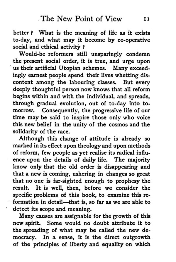 Although this change of attitude is already so marked in its effect upon theology and upon methods of reform, few people as yet realise its radical influence upon the details of daily life. The majority know only that the old order is disappearing and that a new is coming, ushering in changes so great that no one is far-sighted enough to prophesy the result. It is well, then, before we consider the specific problems of this book, to examine this reformation in detail—that is, so far as we are able to detect its scope and meaning.