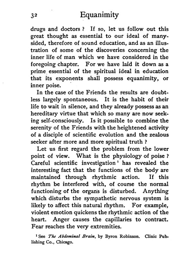 drugs and doctors? If so, let no follow out this great thought as essential to our ideal of manysided, therefore of sound education, and as an illustration of some of the discoveries concerning the inner life of man which we have considered in the foregoing chapter. For we have laid it down as a prime essential of the spiritual ideal in education that its exponents shall possess equanimity, or inner poise.
