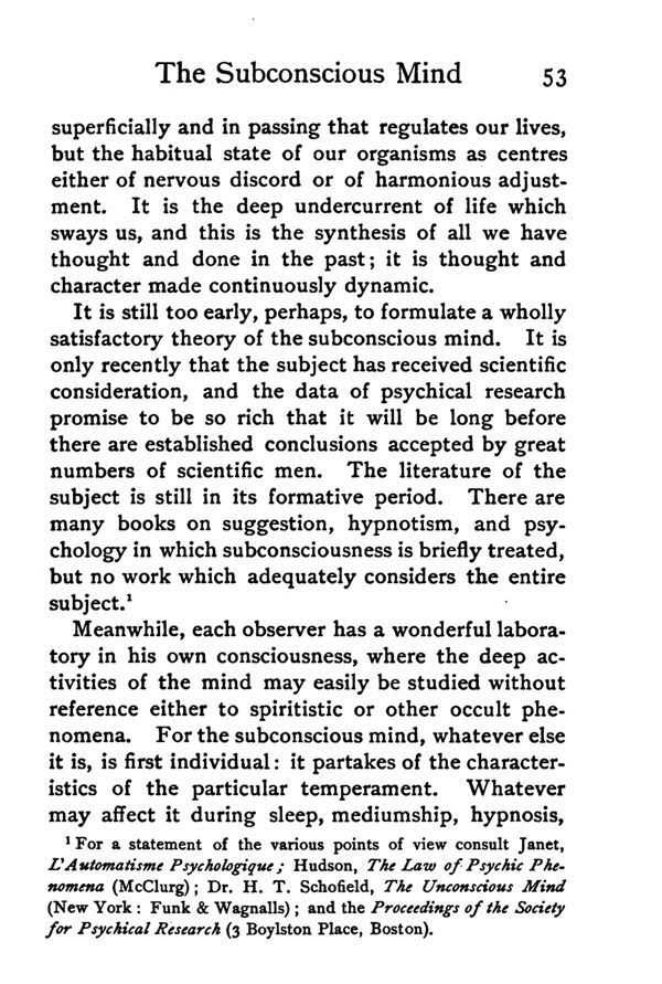 (1) For a statement of the various points of view consult Janet, L'Automatisms Psychologique; Hudson, The Law of Psychic Phenomena, (McClurg); Dr. H. T. Schofield, The Unconscious Mind (New York; Funk & Wagnalls); and the Proceedings of the Society for Psychical Research (3 Boylston Place, Boston).