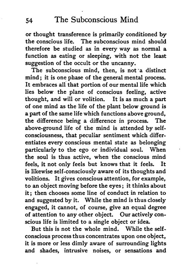 The subconscious mind, then, is not a distinct mind; it is one phase of the general mental process. It embraces all that portion of our mental life which lies below the plane of conscious feeling, active thought, and will or volition. It is as much a part of one mind as the life of the plant below ground is a part of the same life which functions above ground, the difference being a difference in process. The above-ground life of the mind is attended by self-consciousness, that peculiar sentiment which differentiates every conscious mental state as belonging particularly to the ego or individual soul. When the soul is thus active, when the conscious mind feels, it not only feels but knows that it feels. It is likewise self-consciously aware of its thoughts and volitions. It gives conscious attention, for example, to an object moving before the eyes; it thinks about it; then chooses some line of conduct in relation to and suggested by it. While the mind is thus closely engaged, it cannot, of course, give an equal degree of attention to any other object. Our actively conscious life is limited to a single object or idea.