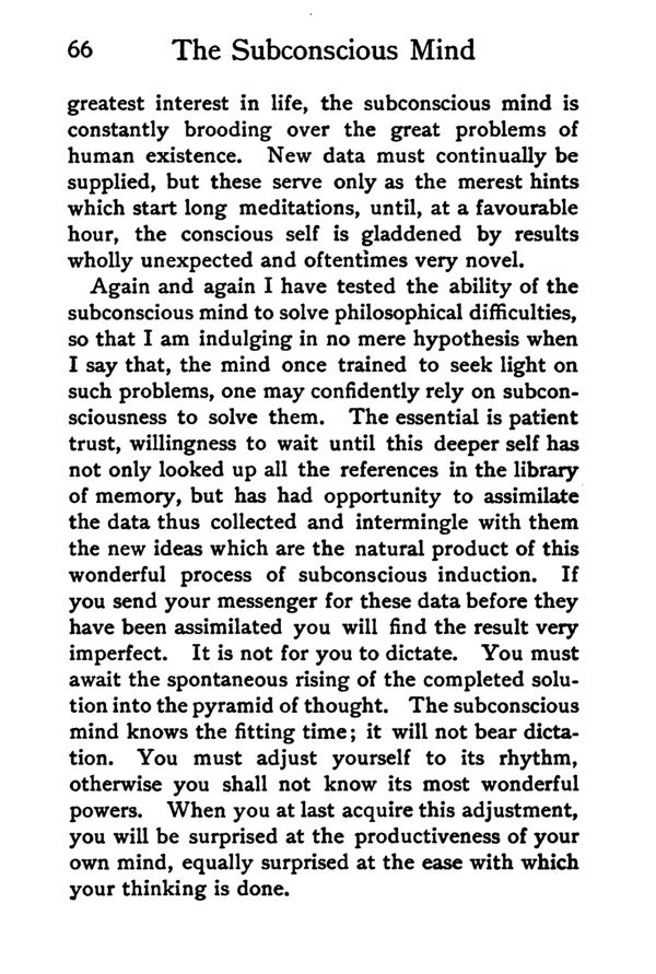 Again and again I have tested the ability of the subconscious mind to solve philosophical difficulties, so that I am indulging in no more hypothesis when I say that, the mind once trained to seek light on such problems, one may confidently rely on subconsciousness to solve them. The essential is patient trust, willingness to wait until this deeper self has not only looked up all the references in the library of memory, but has had opportunity to assimilate the data thus collected and intermingle with them the new ideas which are the natural product of this wonderful process of subconscious induction. If you send your messenger for these data before they have been assimilated you will find the result very imperfect. It is not for you to dictate. You must await the spontaneous rising of the completed solution into the pyramid of thought. The subconscious mind knows the fitting time; it wilt not bear dictation. You must adjust yourself to its rhythm, otherwise you shall not know its most wonderful powers. When you at last acquire this adjustment, you will be surprised at the productiveness of your own mind, equally surprised at the ease with which your thinking is done.