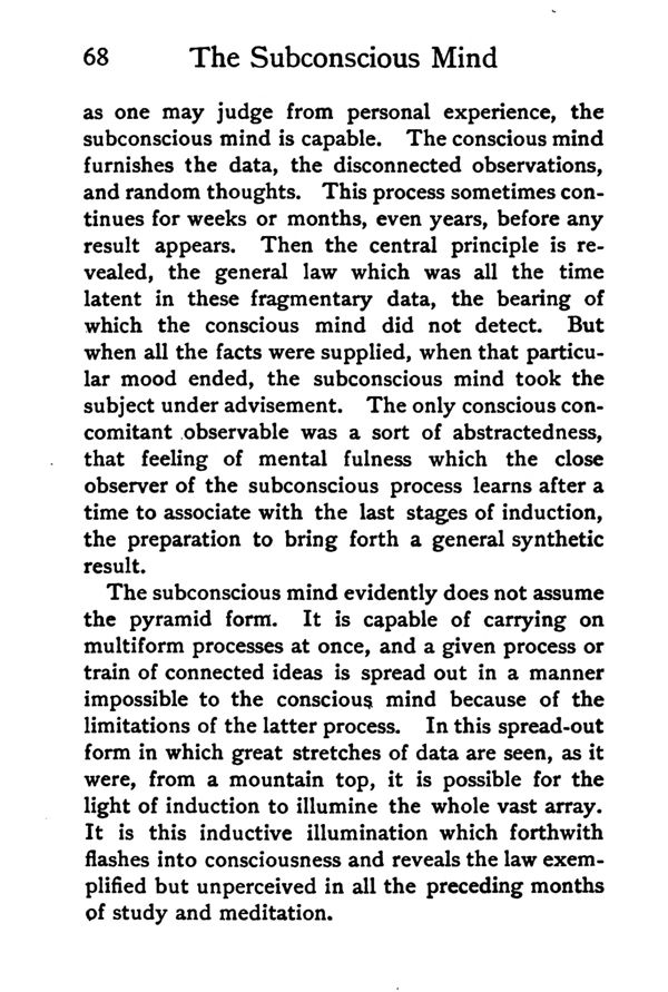 The subconscious mind evidently does not assume the pyramid form. It is capable of carrying on multiform processes at once, and a given process or train of connected ideas is spread out inner impossible to the conscious mind because of the limitations of the latter process. In this spread-out form in which great stretches of data are seen, as it were, from a mountain top, it is possible for the light of induction to illumine the whole vast array. It is this inductive illumination which forthwith flashes into consciousness and reveals the law exemplified but unperceived in all the preceding months of study and meditation.