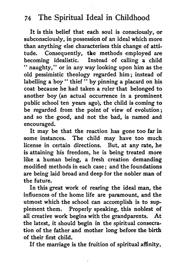 It is this belief that each soul is consciously, or subconsciously, in possession of an ideal which more than anything else characterises this change of attitude. Consequently, the methods employed are becoming idealistic. Instead of calling a child "naughty," or in any way looking upon him as the old pessimistic theology regarded him; instead of labelling a boy "thief" by pinning a placard on his coat because he had taken a ruler that belonged to another boy (an actual occurrence in a prominent public school ten years ago), the child is coming to be regarded from the point of view of evolution; and so the good, and not the bad, is named and encouraged.