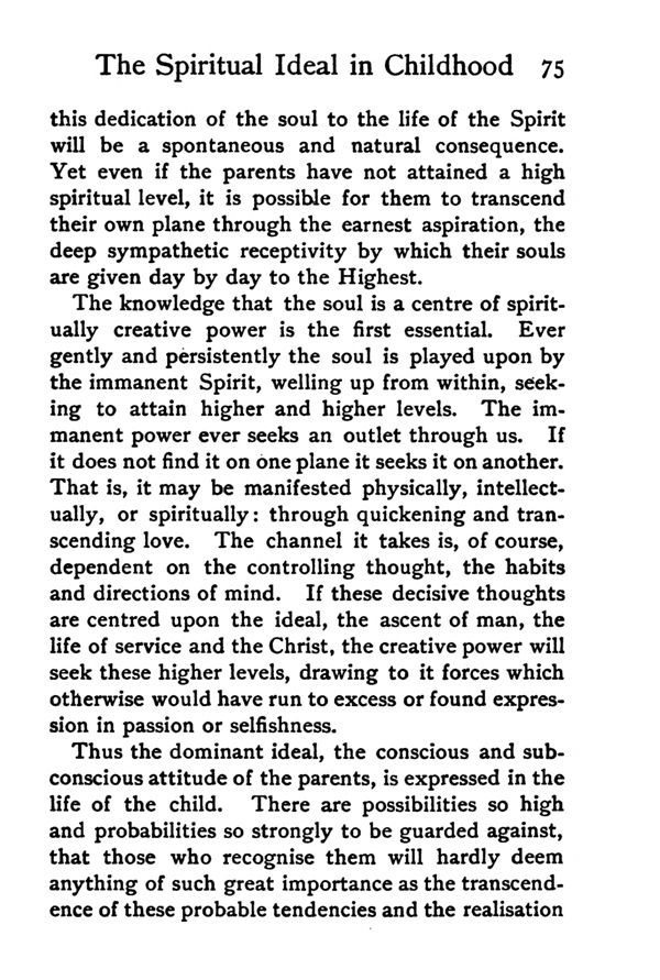 this dedication of the soul to the life of the Spirit will be a spontaneous and natural consequence. Yet even if the parents have not attained a high spiritual level, it is possible for them to transcend their own plane through the earnest aspiration, the deep sympathetic receptivity by which their souls are given day by day to the Highest.