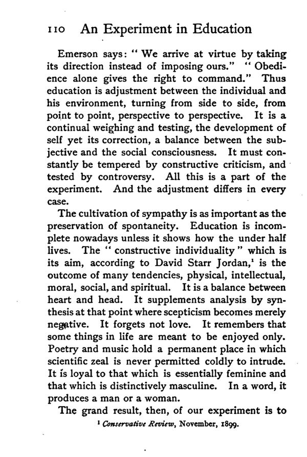 Emerson says: "We arrive at virtue by taking its direction instead of imposing ours." "Obedience alone gives the right to command." Thus education is adjustment between the individual and his environment, turning from side to side, from point to point, perspective to perspective. It is a continual weighing and testing, the development of self yet its correction, a balance between the subjective and the social consciousness. It must constantly be tempered by constructive criticism, and tested by controversy. All this is a part of the experiment. And the adjustment differs in every case.