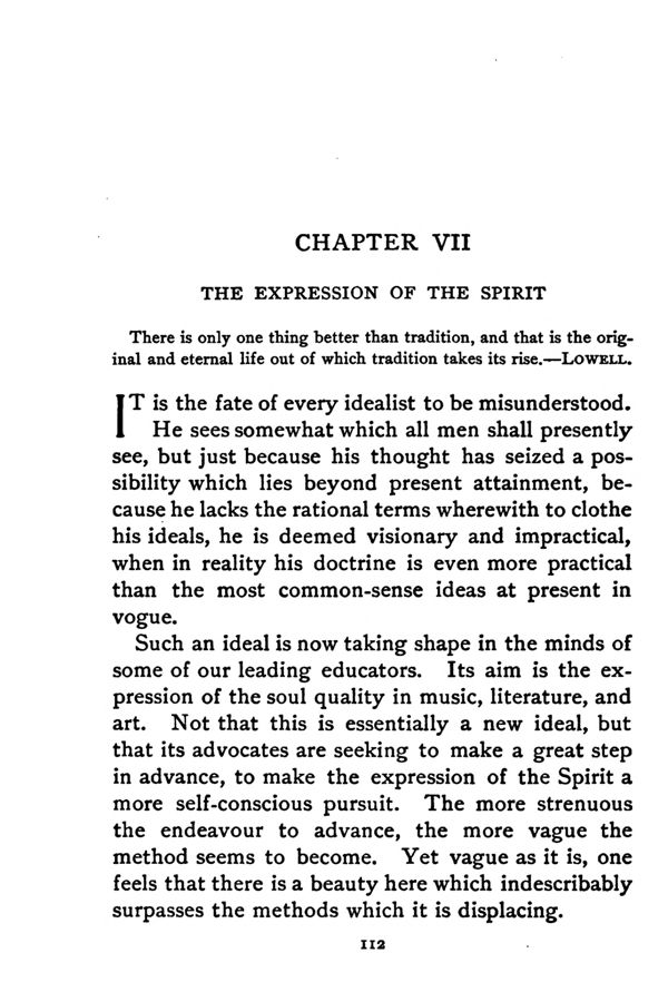 Such an ideal is now taking shape in the minds of some of our leading educators. Its aim is the expression of the soul quality in music, literature, and art. Not that this is essentially a new ideal, but that its advocates are seeking to make a great step in advance, to make the expression of the Spirit a more self-conscious pursuit. The more strenuous the endeavour to advance, the more vague the method seems to become. Yet vague as it is, one feels that there is a beauty here which indescribably surpasses the methods which it is displacing.