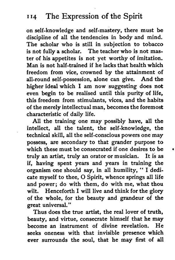 All the training one may possibly have, all the intellect, all the talent, the self-knowledge, the technical skill, all the self-conscious powers one may possess, are secondary to that grander purpose to which these must be consecrated if one desires to be truly an artist, truly an orator or musician. It is as if, having spent years and years in training the organism one should say, in all humility, "I dedicate myself to thee, 0 Spirit, whence springs all life and power; do with them, do with me, what thou wilt. Henceforth I will live and think for the glory of the whole, for the beauty and grandeur of the great universal."