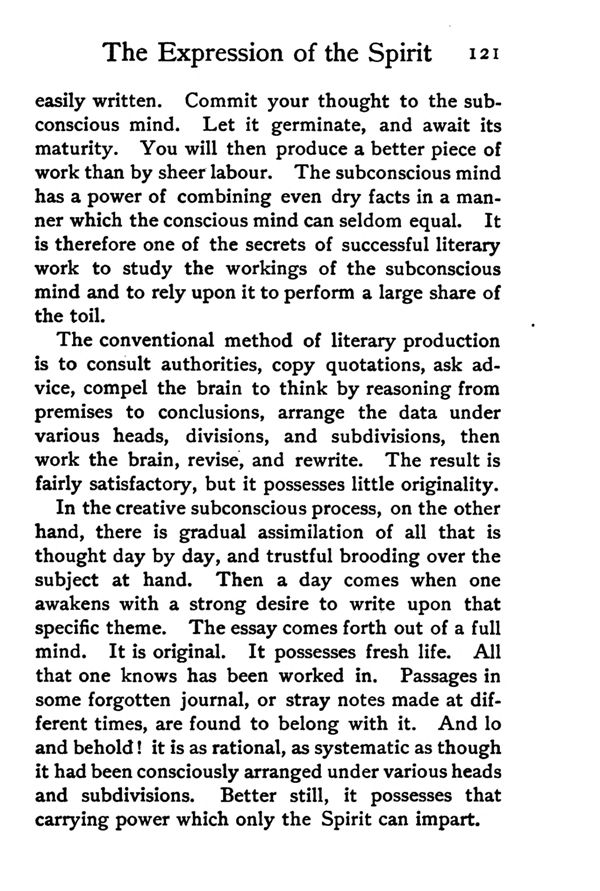 In the creative subconscious process, on the other hand, there is gradual assimilation of all that is thought day by day, and trustful brooding over the subject at hand. Then a day comes when one awakens with a strong desire to write upon that specific theme. The essay comes forth out of a full mind. It is original. It possesses fresh life. All that one knows has been worked in. Passages in some forgotten journal, or stray notes made at different times, are found to belong with it. And to and behold! it is as rational, as systematic as though it had been consciously arranged under various heads and subdivisions. Better still, it possesses that carrying power which only the Spirit can impart.
