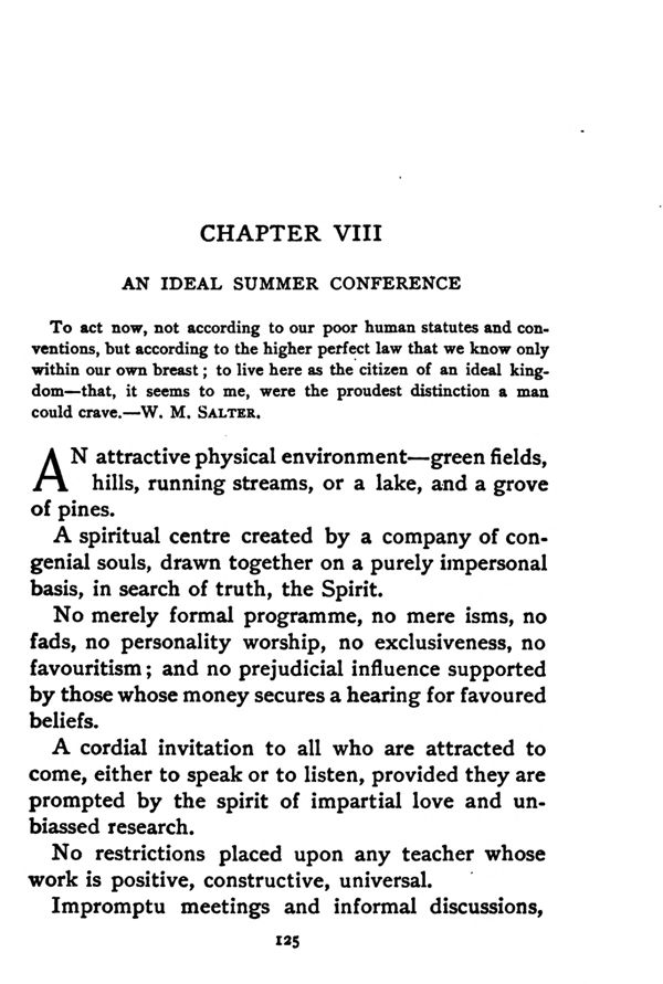 No merely formal programme, no mere isms, no fads, no personality worship, no exclusiveness, no favouritism; and no prejudicial influence supported by those whose money secures a hearing for favoured beliefs.
