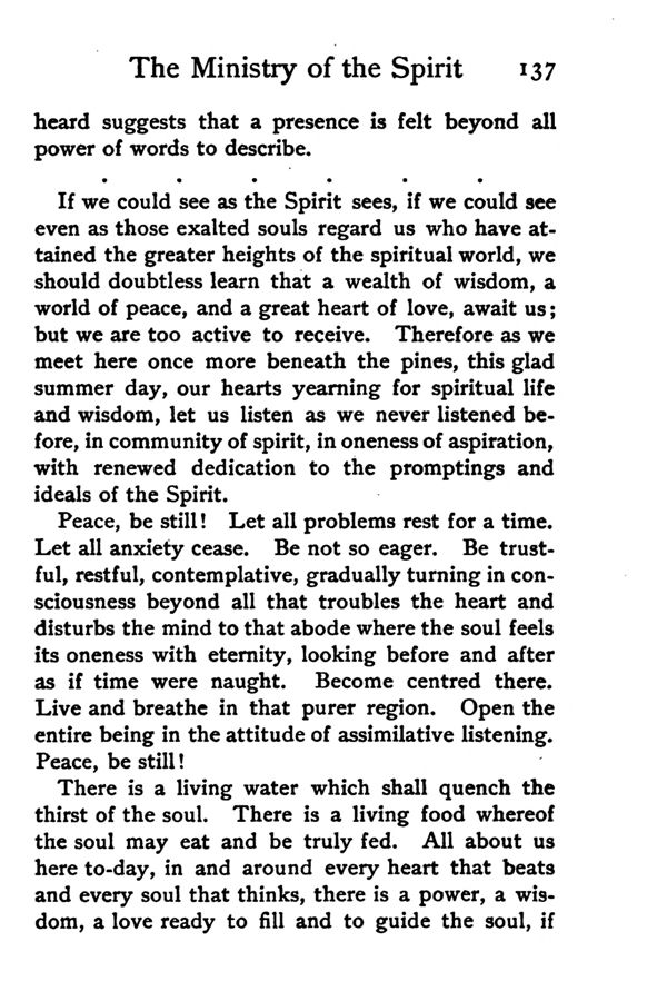 If we could see as the Spirit sees, if we could see even as those exalted souls regard us who have attained the greater heights of the spiritual world, we should doubtless learn that a wealth of wisdom, a world of peace, and a great heart of love, await us; but we are too active to receive. Therefore as we meet here once more beneath the pines, this glad summer day, our hearts yearning for spiritual life and wisdom, let or listen as we never listened before, in community of spirit, in oneness of aspiration, with renewed dedication to the promptings and ideals of the Spirit.
