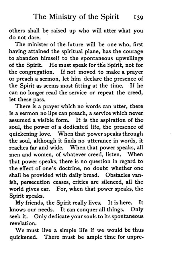 The minister of the future will be one who, first having attained the spiritual plane, has the courage to abandon himself to the spontaneous upwellings of the Spirit. He must speak for the Spirit, not for the congregation. If not moved to make a prayer or preach a sermon, let him declare the presence of the Spirit as seems most fitting at the time. If he can no longer read the service or repeat the creed, let these pass.