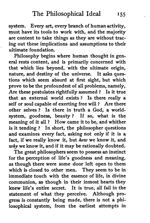 Philosophy begins where human thought in general rests content, and is primarily concerned with that which lies beyond, with the ultimate origin, nature, and destiny of the universe. It asks questions which seem absurd at first sight, but which prove to be the profoundest of all problems, namely, Are these postulates rightfully assumed Is it true that an external world exists Is there really a self or soul capable of exerting free will? Are there other selves? Is there in truth a God, a world system, goodness, beauty? If so, what is the meaning of it all? How came it to be, and whither is it tending? In short, the philosopher questions and examines every fact, asking not only if it is a fact, if we really know it, but how we know it, and why we know it, and if it may be rationally doubted.