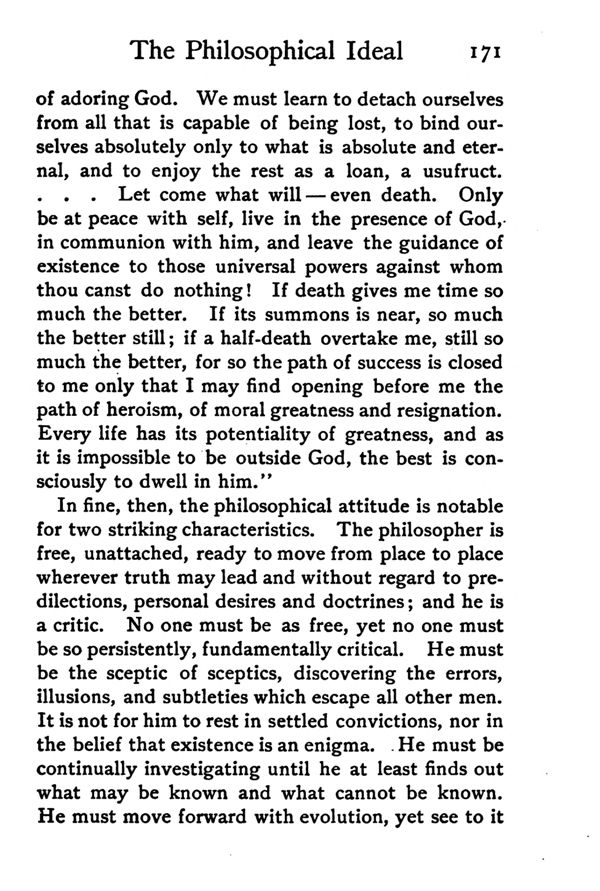 In fine, then, the philosophical attitude is notable for two striking characteristics. The philosopher is free, unattached, ready to move from place to place wherever truth may lead and without regard to predilections, personal desires and doctrines; and he is a critic. No one must be as free, yet no one must be so persistently, fundamentally critical. He must he the sceptic of sceptics, discovering the errors, illusions, and subtleties which escape all other men. It is not for him to rest in settled convictions, one in the belief that existence is an enigma. He must be continually investigating until he at least finds out what may be known and what cannot be known. He must move forward with evolution, yet see to it