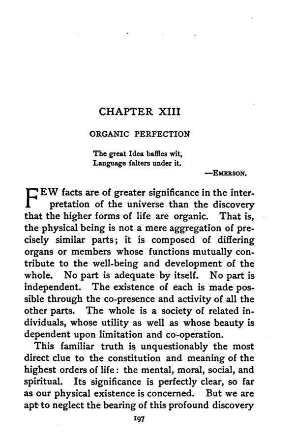 FEW facts are of greater significance in the interpretation of the universe than the discovery that the higher forms of life are organic. That is, the physical being is not a mere aggregation of precisely similar parts; it is composed of differing organs or members whose functions mutually contribute to the well-being and development of the whole. No part is adequate by itself. No part is independent. The existence of each is made possible through the co-presence and activity of all the other parts. The whole is a society of related individuals, whose utility as well as whose beauty is dependent upon limitation and co-operation.