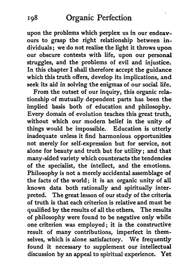 From the outset of our inquiry, this organic relationship of mutually dependent parts has been the implied basis both of education and philosophy. Every domain of evolution teaches this great truth, without which our modern belief in the unity of things would be impossible. Education is utterly inadequate unless it find harmonious opportunities not merely for self-expression but for service, not alone for beauty and truth but for utility; and that many-sided variety which counteracts the tendencies of the specialist, the intellect, and the emotions. Philosophy is not a merely accidental assemblage of the facts of the world; it is an organic unity of all known data both rationally and spiritually interpreted. The great lesson of our study of the criteria of truth is that each criterion is relative and must be qualified by the results of all the others. The results of philosophy were found to be negative only while one criterion was employed; it is the constructive result of many contributions, imperfect in themselves, which is alone satisfactory. We frequently found it necessary to supplement our intellectual discussion by an appeal to spiritual experience. Yet