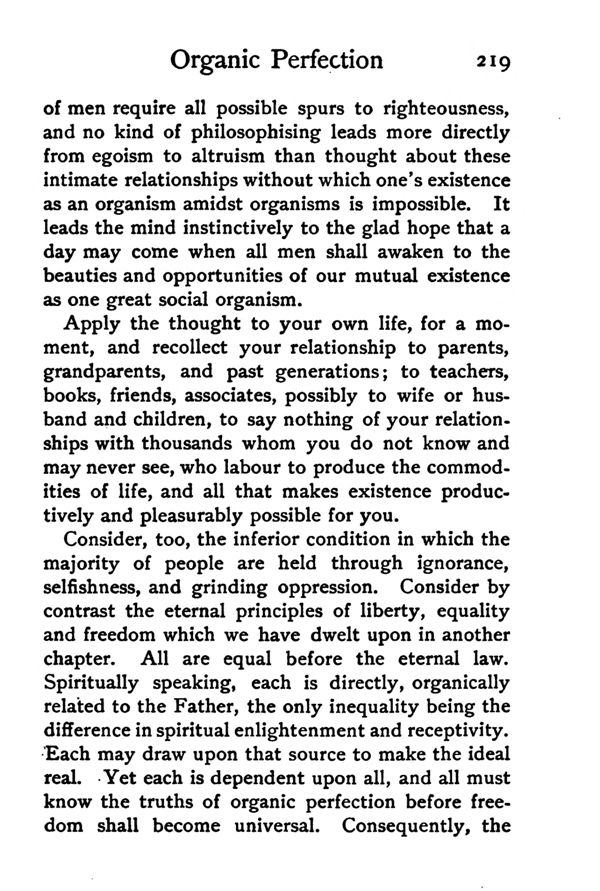 Consider, too, the inferior condition in which the majority of people are held through ignorance, selfishness, and grinding oppression. Consider by contrast the eternal principles of liberty, equality and freedom which we have dwelt upon in another chapter. All are equal before the eternal law. Spiritually speaking, each is directly, organically related to the Father, the only inequality being the difference in spiritual enlightenment and receptivity. Each may draw upon that source to make the ideal real. Yet each is dependent upon all, and all most know the truths of organic perfection before freedom shall become universal. Consequently, the