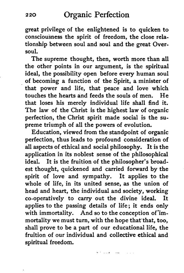 Education, viewed from the standpoint of organic perfection, thus leads to profound consideration of all aspects of ethical and social philosophy. It is the application in its noblest sense of the philosophical ideal. It is the fruition of the philosopher's broadest thought, quickened and carried forward by the spirit of love and sympathy. It applies to the whole of life, in its united sense, as the union of head and heart, the individual and society, working co-operatively to carry out the divine ideal. It applies to the passing details of life; it ends only with immortality. And so to the conception of immortality we must turn, with the hope that that, too, shall prove to be a part of our educational life, the fruition of our individual and collective ethical and spiritual freedom.