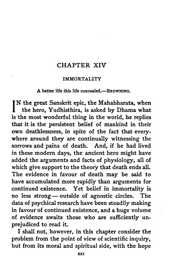 IN the great Sanskrit epic, the Mahabharata, when the hero, Yudhisthira, is asked by Dhama what is the most wonderful thing in the world, he replies that it is the persistent belief of mankind in their own deathlessness, in spite of the fact that everywhere around they are continually witnessing the sorrows and pains of death. And, if he had lived in these modern days, the ancient hero might have added the arguments and facts of physiology, all of which give support to the theory that death ends all. The evidence in favour of death may be said to have accumulated more rapidly than arguments for continued existence. Yet belief in immortality is no less strong—outside of agnostic circles. The data of psychical research have been steadily making in favour of continued existence, and a huge volume of evidence awaits those who are sufficiently unprejudiced to read it.