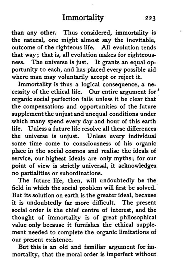Immortality is thus a logical consequence, a necessity of the ethical life. Our entire argument for' organic social perfection fails unless it be clear that the compensations and opportunities of the future supplement the unjust and unequal conditions under which many spend every day and hour of this earth life. Unless a future life resolve all these differences the universe is unjust. Unless every individual some time come to consciousness of his organic place in the social cosmos and realise the ideals of service, our highest ideals are only myths; for our point of view is strictly universal, it acknowledges no partialities or subordinations.