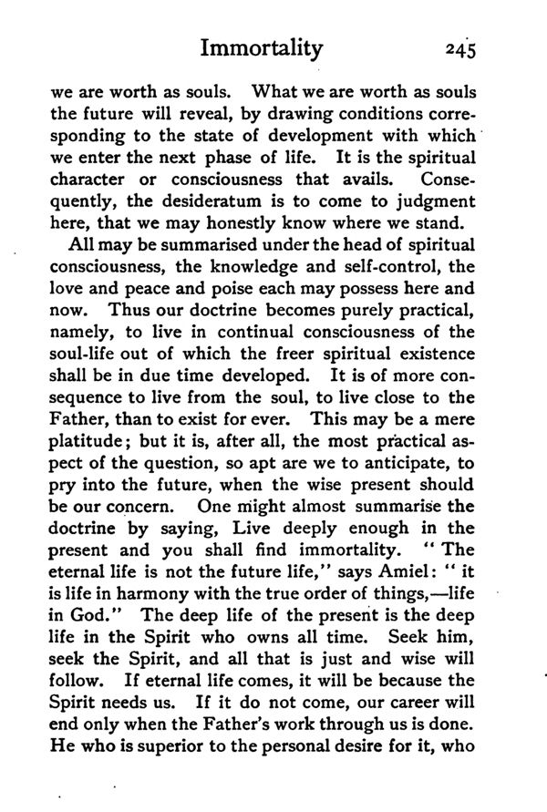 All may be summarised under the head of spiritual consciousness, the knowledge and self-control, the love and peace and poise each may possess here and now. Thus our doctrine becomes purely practical, namely, to live in continual consciousness of the soul-life out of which the freer spiritual existence shall be in due time developed. It is of more consequence to live from the soul, to live close to the Father, than to exist for ever. This may be a mere platitude; but it is, after all, the most practical aspect of the question, so apt are we to anticipate, to pry into the future, when the wise present should he our concern. One might almost summarise the doctrine by saying, Live deeply enough in the present and you shall find immortality. "The eternal life is not the future life," says Amiel: "it is life in harmony with the true order of things,—life in God." The deep life of the present is the deep life in the Spirit who owns all time. Seek him, seek the Spirit, and all that is just and wise will follow. If eternal life comes, it will be because the Spirit needs us. If it do not come, our career will end only when the Father's work through as is done. He who is superior to the personal desire for it, who