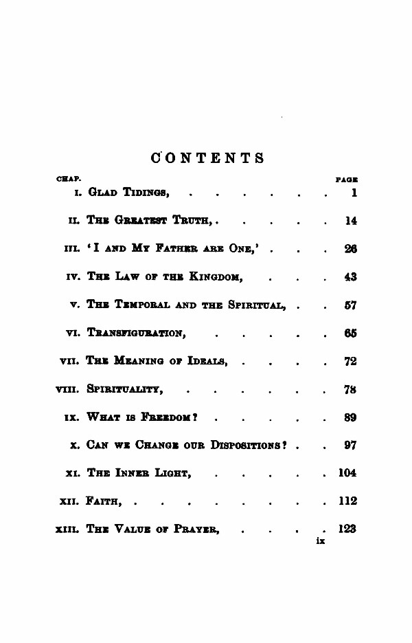 Contents - Foreword - Glad Tidings - The Greatest Truth - I and My Father Are One - Law of the Kingdom - Temporal and the Spiritual - Transfiguration - Meaning of Ideals - Spirituality - What Is Freedom? - Can We Change Our Dispositions? - The Inner Light - Faith - Value of Praye - Fatherhood of God - Law of Human Evolution - Wisdom - Harmony - Thoughts - Prejudice - What is the Higher Life? - God is Love - Power of Truth -