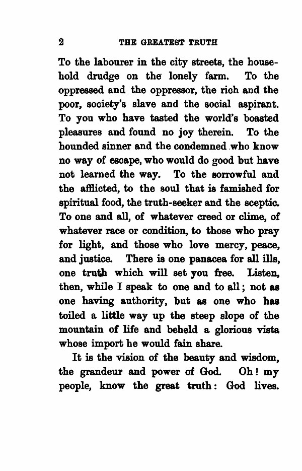 Contents - Foreword - Glad Tidings - The Greatest Truth - I and My Father Are One - Law of the Kingdom - Temporal and the Spiritual - Transfiguration - Meaning of Ideals - Spirituality - What Is Freedom? - Can We Change Our Dispositions? - The Inner Light - Faith - Value of Praye - Fatherhood of God - Law of Human Evolution - Wisdom - Harmony - Thoughts - Prejudice - What is the Higher Life? - God is Love - Power of Truth -
