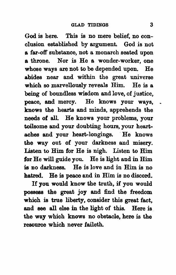 Contents - Foreword - Glad Tidings - The Greatest Truth - I and My Father Are One - Law of the Kingdom - Temporal and the Spiritual - Transfiguration - Meaning of Ideals - Spirituality - What Is Freedom? - Can We Change Our Dispositions? - The Inner Light - Faith - Value of Praye - Fatherhood of God - Law of Human Evolution - Wisdom - Harmony - Thoughts - Prejudice - What is the Higher Life? - God is Love - Power of Truth -