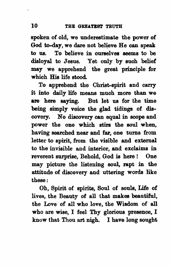 spoken of old, we underestimate the power of God to-day, we dare not believe He can speak to us. To believe in ourselves seems to be disloyal to Jesus. Yet only by such belief may we apprehend the great principle for which His life stood. To apprehend the Christ-spirit and carry it into daily life means much more than we are here saying. But let us for the time being simply voice the glad tidings of discovery. No discovery can equal in scope and power the one which stirs the soul when, having searched near and far, one turns from letter to spirit, from the visible and external to the invisible and interior, and exclaims in reverent surprise, Behold, God is here! One may picture the listening soul, rapt in the attitude of discovery and uttering words like these. Oh, Spirit of spirits, Soul of souls, Life of lives, the Beauty of all that makes beautiful, the Love of all who love, the Wisdom of all who are wise, I feel Thy glorious presence, I know that Thou art nigh. I have long sought