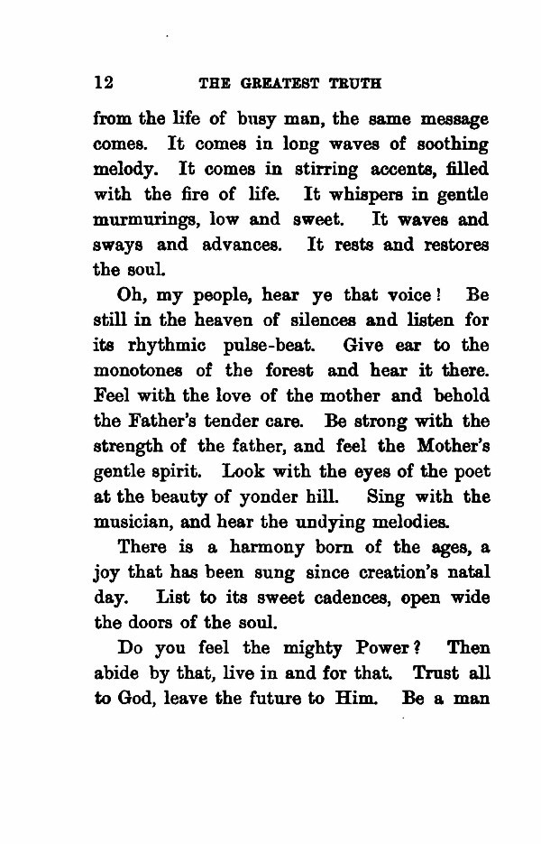 from the life of busy man, the same message comes. It comes in long waves of soothing melody. It comes in stirring accents, filled with the fire of life. It whispers in gentle murmurings, low and sweet. It waves and sways and advances. It rests and restores the soul. Oh, my people, hear ye that voice! Be still in the heaven of silences and listen for its rhythmic pulse-beat. Give ear to the monotones of the forest and hear it there. Feel with the love of the mother and behold the Father's tender care. Be strong with the strength of the father, and feel the Mother's gentle spirit. Look with the eyes of the poet at the beauty of yonder hill. Sing with the musician, and hear the undying melodies. There is a harmony born of the ages, a joy that has been sung since creation's natal day. List to its sweet cadences, open wide the doors of the soul. Do you feel the mighty Power? Then abide by that, live in and for that. Trust all to God, leave the future to Him. Be a man