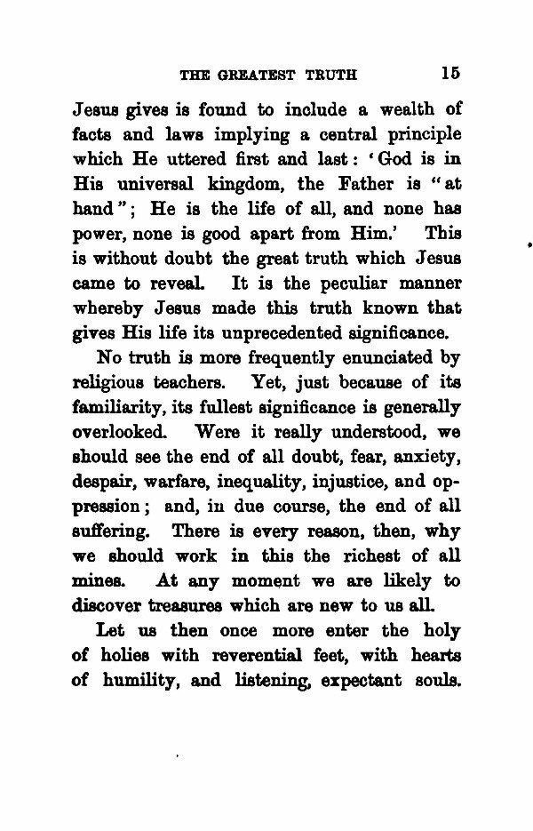 Jesus gives is found to include a wealth of facts and laws implying a central principle which He uttered first and last: God is in His universal kingdom, the Father is "at hand"; He is the life of all, and none has power, none is good apart from Him.' This is without doubt the great truth which Jesus came to reveal.. It is the peculiar manner whereby Jesus made this truth known that gives His life its unprecedented significance. No truth is more frequently enunciated by religious teachers. Yet, just because of its familiarity, its fullest significance is generally overlooked. Were it really understood, we should see the end of all doubt, fear, anxiety, despair, warfare, inequality, injustice, and oppression; and, in due course, the end of all suffering. There is every reason, then, why we should work in this the richest of all mines. At any moment we are likely to discover treasures which are new to us all. Let us then once more enter the holy of holies with reverential feet, with hearts of humility, and listening, expectant souls.