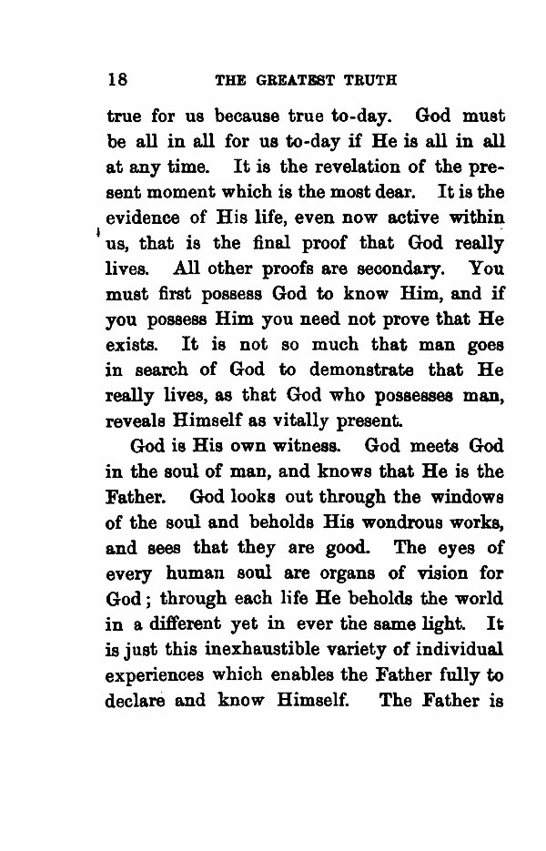 true for us because true to-day. God must be all in all for us to-day if He is all in all at any time. It is the revelation of the pre- sent moment which is the most dear. It is the evidence of His life, even now active within us, that is the final proof that God really lives. All other proofs are secondary. You must first possess God to know Him, and if you possess Him you need not prove that He exists. It is not so much that man goes in search of God to demonstrate that He really lives, as that God who possesses man, reveals Himself as vitally present. God is His own witness. God meets God in the soul of man, and knows that He is the Father. God looks out through the windows of the soul and beholds His wondrous works, and sees that they are good. The eyes of every human soul are organs of vision for God; through each life He beholds the world in a different yet in ever the same light. It is just this inexhaustible variety of individual experiences which enables the Father fully to declare and know Himself. The Father is