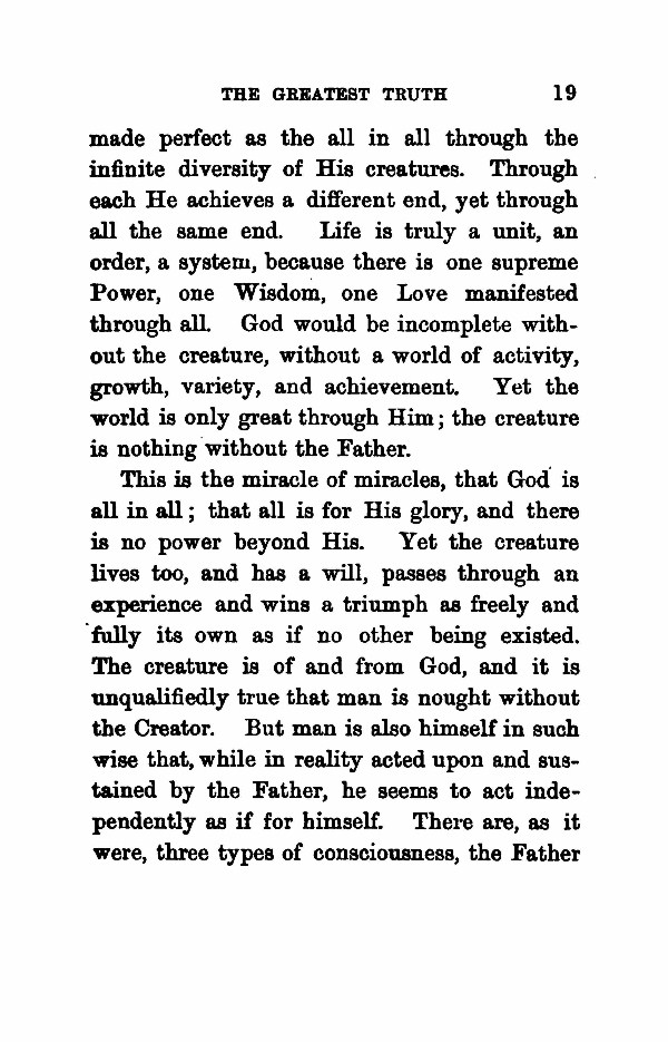made perfect as the all in all through the infinite diversity of His creatures. Through each He achieves a different end, yet through all the same end. Life is truly a unit, an order, a system, because there is one supreme Power, one Wisdom, one Love manifested through all. God would be incomplete without the creature, without a world of activity, growth, variety, and achievement. Yet the world is only great through Him; the creature is nothing without the Father. This is the miracle of miracles, that God is all in all; that all is for His glory, and there is no power beyond His. Yet the creature lives too, and has a will, passes through an experience and wins a triumph as freely and fully its own as if no other being existed. The creature is of and from God, and it is unqualifiedly true that man is nought without the Creator. But man is also himself in such wise that, while in reality acted upon and sustained by the Father, he seems to act independently as if for himself. There are, as it were, three types of consciousness, the Father