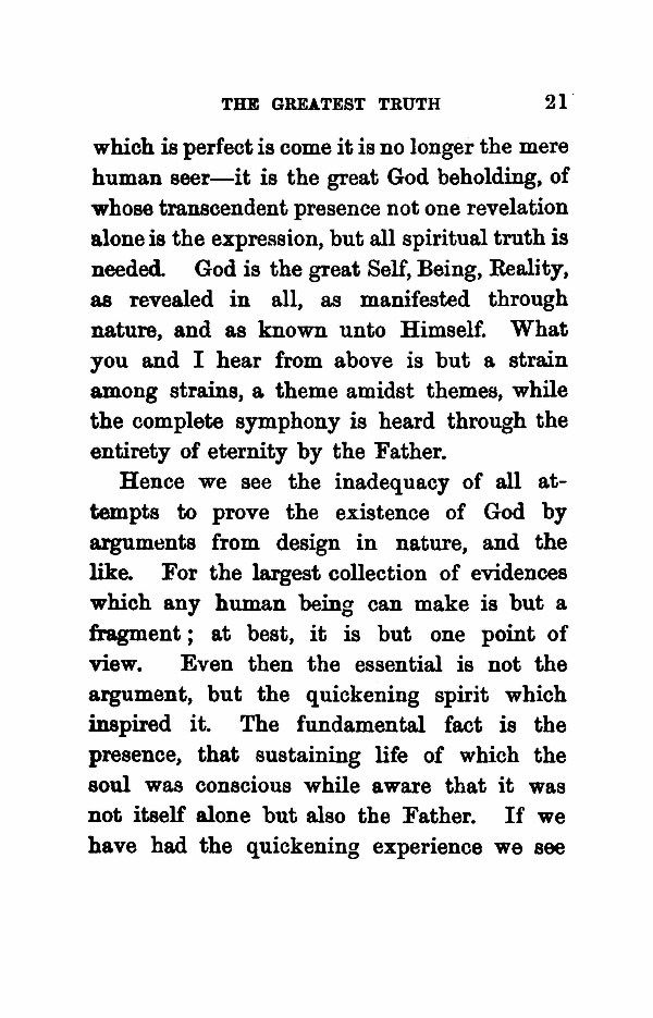 which is perfect is come it is no longer the mere human seer --- it is the great God beholding, of whose transcendent presence not one revelation alone is the expression, but all spiritual truth is needed. God is the great Self, Being, Reality, as revealed in all, as manifested through nature, and as known unto Himself. What you and I hear from above is but a strain among strains, a theme amidst themes, while the complete symphony is heard through the entirety of eternity by the Father. Hence we see the inadequacy of all attempts to prove the existence of God by arguments from design in nature, and the like. For the largest collection of evidences which any human being can make is but a fragment at best, it is but one point of view. Even then the essential is not the argument, but the quickening spirit which inspired it. The fundamental fact is the presence, that sustaining life of which the soul was conscious while aware that it was not itself alone but also the Father. If we have had the quickening experience we see