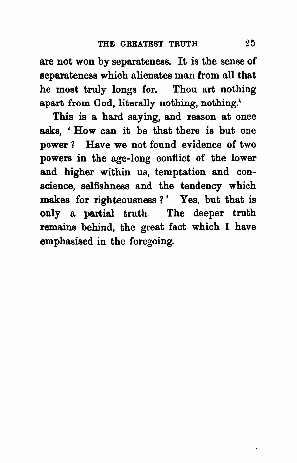 are not won by separateness. It is the sense of separateness which alienates man from all that he most truly longs for. Thou art nothing apart from God, literally nothing, nothing.' This is a hard saying, and reason at once asks, How can it be that there is but one power? Have we not found evidence of two powers in the age-long conflict of the lower and higher within us, temptation and conscience, selfishness and the tendency which makes for righteousness? ' Yes, but that is only a partial truth. The deeper truth remains behind, the great fact which I have emphasised in the foregoing.