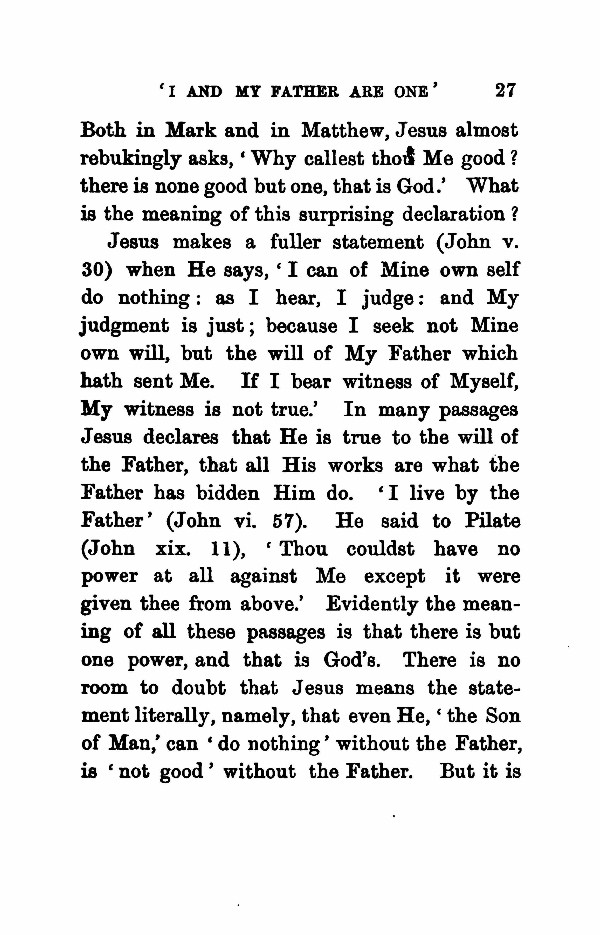 Both in Mark and in Matthew, Jesus almost rebukingly asks, ' Why callest thou Me good? there is none good but one, that is God .' What is the meaning of this surprising declaration? Jesus makes a fuller statement (John v. 30) when He says, ' I can of Mine own self do nothing: as I hear, I judge: and My judgment is just , because I seek not Mine own will, but the will of My Father which hath sent Me. If I bear witness of Myself, My witness is not true.' In many passages Jesus declares that He is true to the will of the Father, that all His works are what the Father has bidden Him do. ' I live by the Father' (John vi. 57). He said to Pilate (John xix. 11), ' Thou couldst have no power at all against Me except it were given thee from above.' Evidently the meaning of all these passages is that there is but one power, and that is God's. There is no room to doubt that Jesus means the state- ment literally, namely, that even He, ' the Son of Man,' can ' do nothing' without the Father, is ' not good ' without the Father. But it is