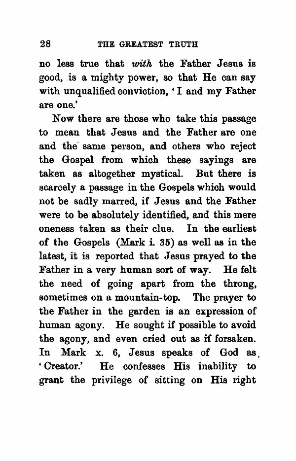 no less true that with the Father Jesus is good, is a mighty power, so that He can say with unqualified conviction, I and my Father are one.' Now there are those who take this passage to mean that Jesus and the Father are one and the same person, and others who reject the Gospel from which these sayings are taken as altogether mystical. But there is scarcely a passage in the Gospels which would not be sadly marred, if Jesus and the Father were to be absolutely identified, and this mere oneness taken as their clue. In the earliest of the Gospels (Mark i. 35) as well as in the latest, it is reported that Jesus prayed to the Father in a very human sort of way. He felt the need of going apart from the throng, sometimes on a mountain-top. The prayer to the Father in the garden is an expression of human agony. He sought if possible to avoid the agony, and even cried out as if forsaken. In Mark x. 6, Jesus speaks of God as , Creator.' He confesses His inability to grant the privilege of sitting on His right